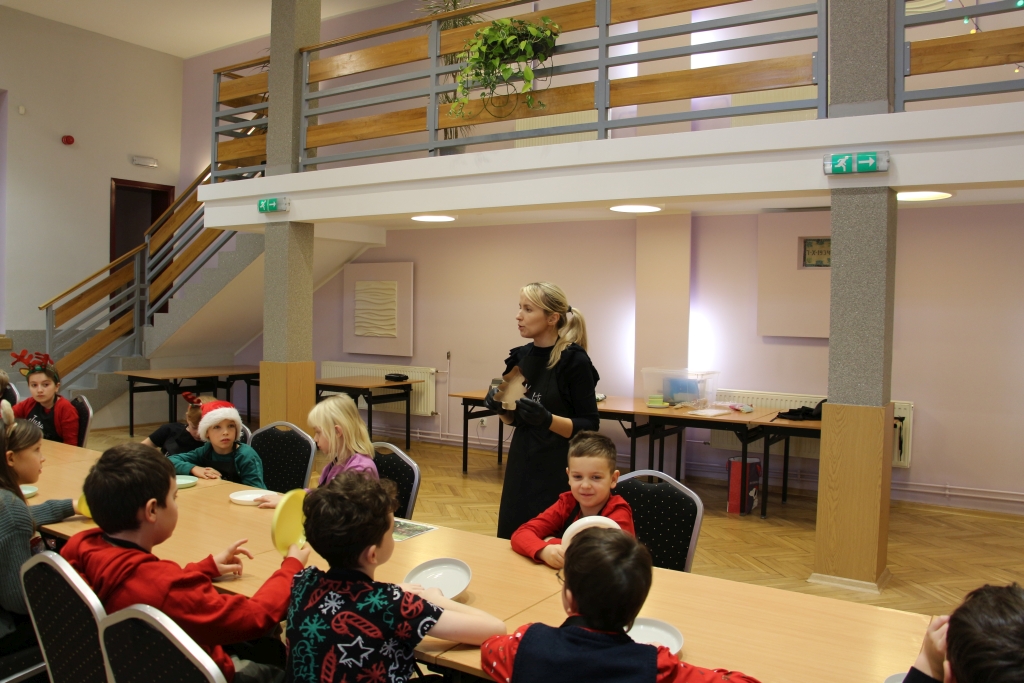 Dużo radości dostarczyły również zimowe zagadki oraz przygotowane karty pracy, dzięki którym uczniowie mogli utrwalić zdobytą wiedzę w formie zabawy. Na zakończenie każdy uczestnik wykonał własną, kolorową świąteczną skarpetę. To kreatywne zadanie okazało się prawdziwym hitem — dzieci z ogromnym zaangażowaniem ozdabiały swoje prace, tworząc niepowtarzalne, świąteczne dekoracje.
