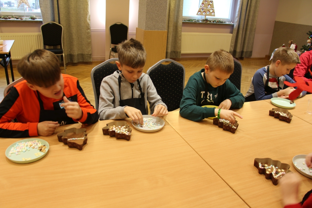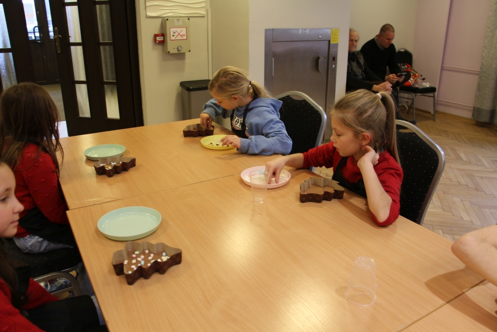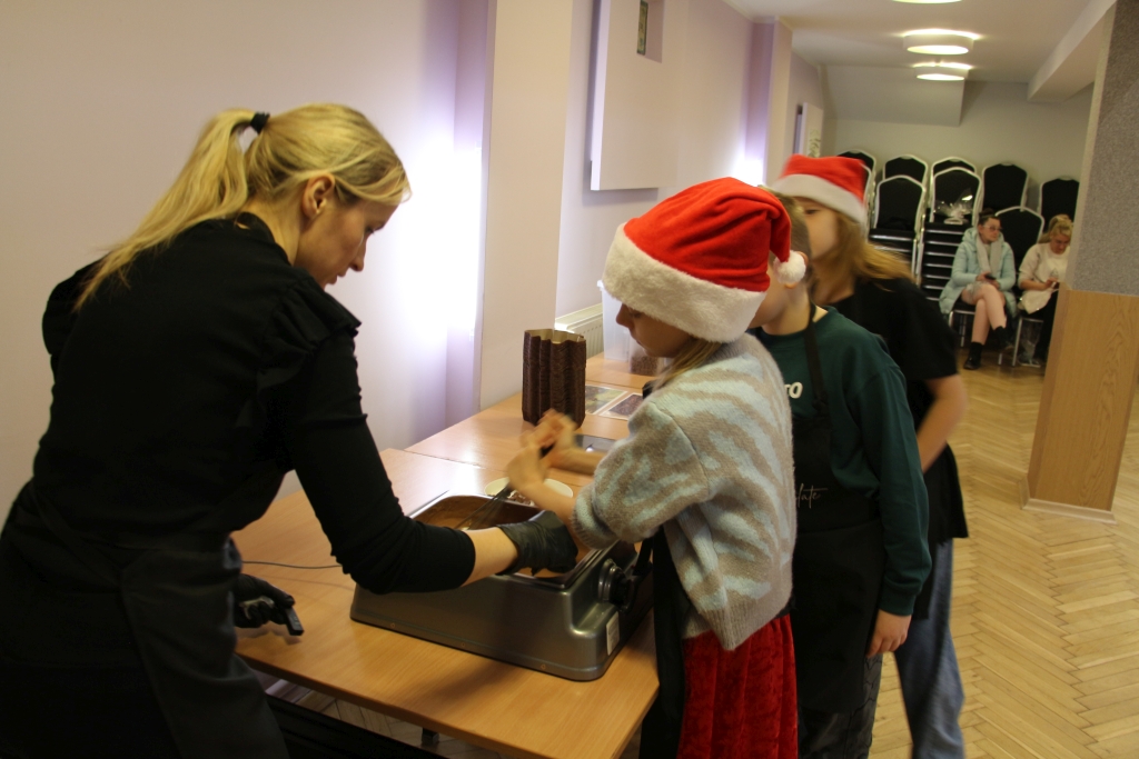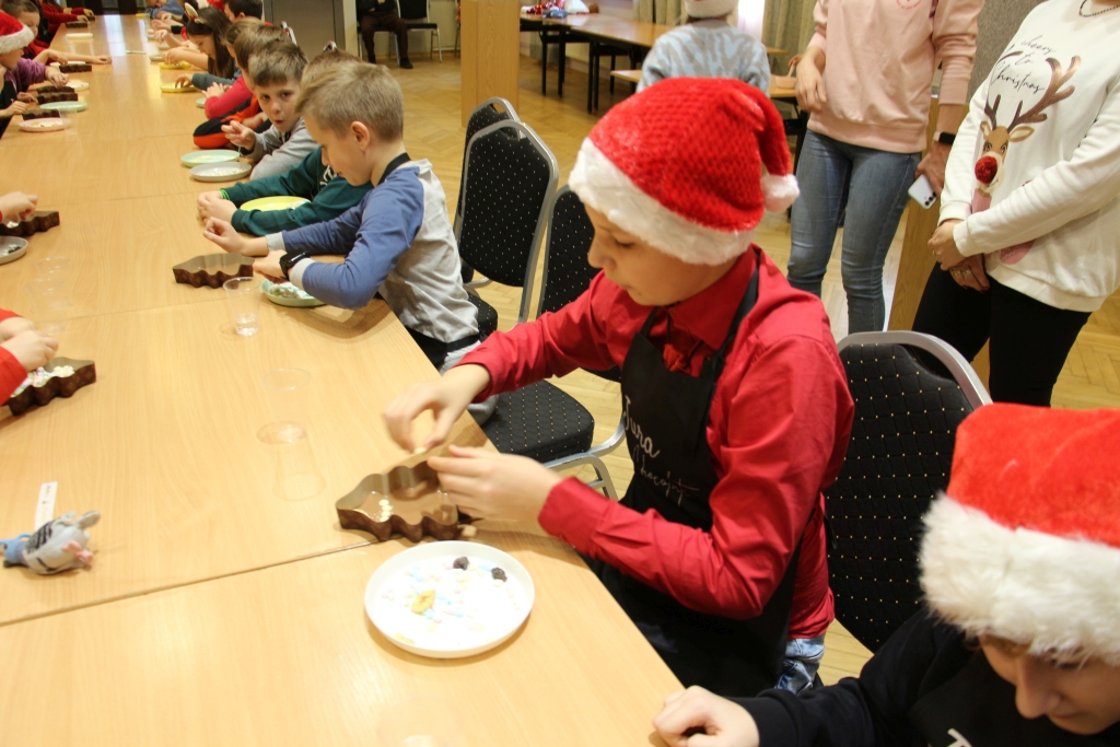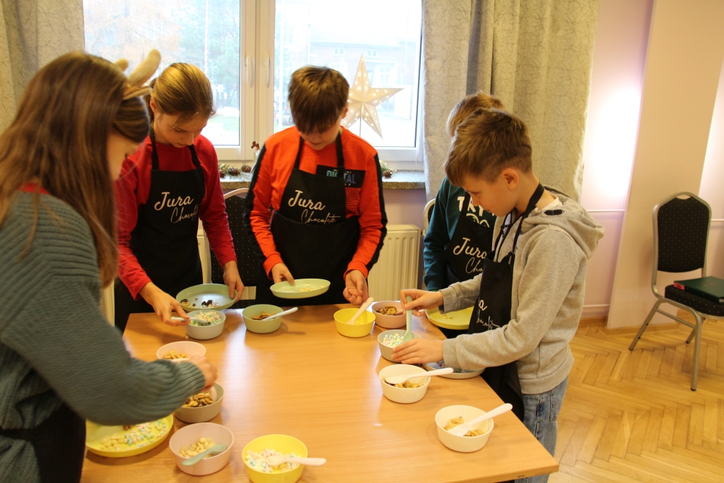 Po wykonaniu wspólnego zdjęcia, pożegnaliśmy naszego wspaniałego gościa, ale to nie był koniec atrakcji. Rozpoczęły się bowiem warsztaty – bardzo niezwykłe, bo czekoladowe! Najpierw dowiedzieliśmy się kilku ciekawostek o samej czekoladzie, a później odbyły się zajęcia praktyczne, na których każdy słuchacz wykonał, a właściwie ozdobił swoją, własną czekoladę! A potem mogliśmy nasze cuda zabrać do domu i wraz z domownikami – zjeść! Pycha!