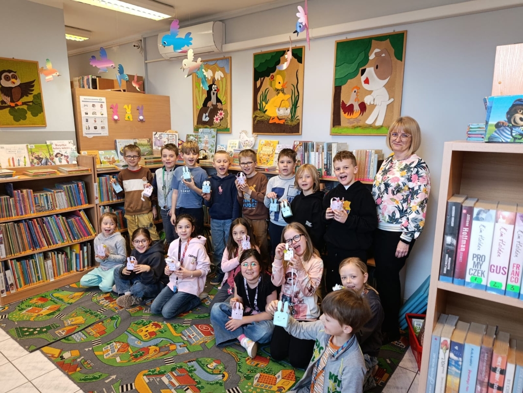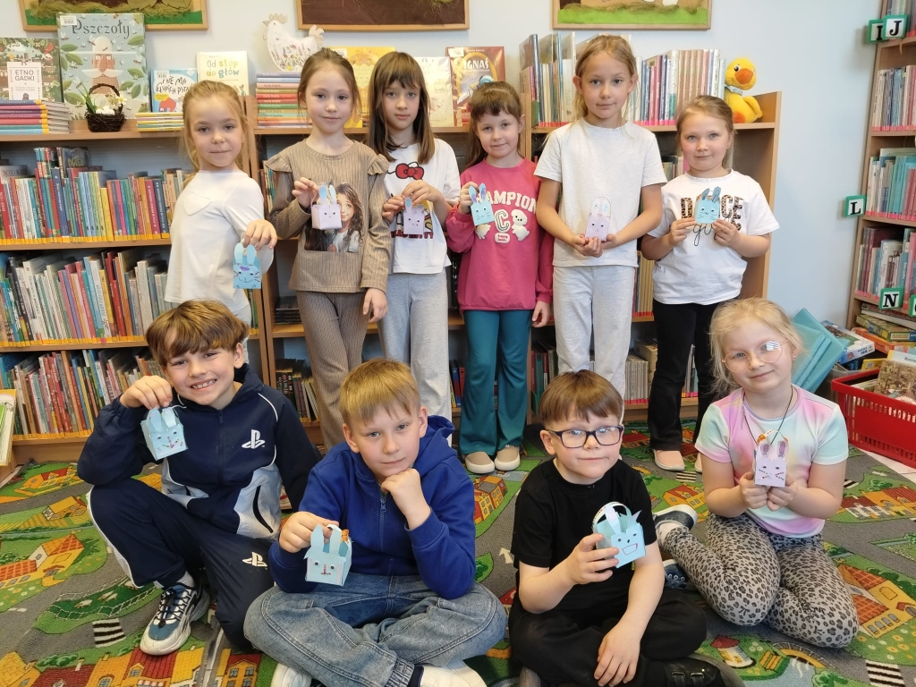 19 marca 2026 r. Filię nr 3 GBP w Sarnowie odwiedzili uczniowie i uczennice klas 1a i 1b z ZSP nr 2 w Sarnowie. Wizyta odbyła się w radosnej, wiosennej atmosferze, a jej tematem przewodnim były zwyczaje i tradycje wielkanocne. Spotkanie rozpoczęliśmy od wspólnego czytania opowiadania z serii przygód Fenka pt. „Wielkanoc”, które wprowadziło dzieci w świąteczny nastrój i stało się punktem wyjścia do dalszych rozmów. Uczniowie chętnie dzielili się swoimi spostrzeżeniami oraz opowiadali o tym, jak w ich domach przygotowuje się do Świąt Wielkanocnych. Nie zabrakło opowieści o malowaniu pisanek, święceniu koszyczków oraz rodzinnych spotkaniach przy świątecznym stole. Kolejnym elementem spotkania były wiosenne zagadki, które dzieci rozwiązywały z dużym zaangażowaniem i entuzjazmem. Była to doskonała okazja do wspólnej zabawy, a jednocześnie utrwalenia wiedzy o oznakach wiosny i symbolach wielkanocnych. Najwięcej radości sprawiła jednak część plastyczna. Dzieci z ogromnym zapałem przystąpiły do pracy i własnoręcznie wykonały koszyczki w kształcie króliczka. Powstały piękne, kolorowe prace, które z pewnością będą wyjątkową ozdobą świątecznych stołów. Na zakończenie spotkania na wszystkich uczestników czekał słodki upominek, który był miłym akcentem podsumowującym wspólnie spędzony czas. Dziękujemy uczniom oraz nauczycielom za odwiedziny, aktywny udział i wspaniałą atmosferę. Takie spotkania są dla nas ogromną radością i inspiracją do kolejnych działań!