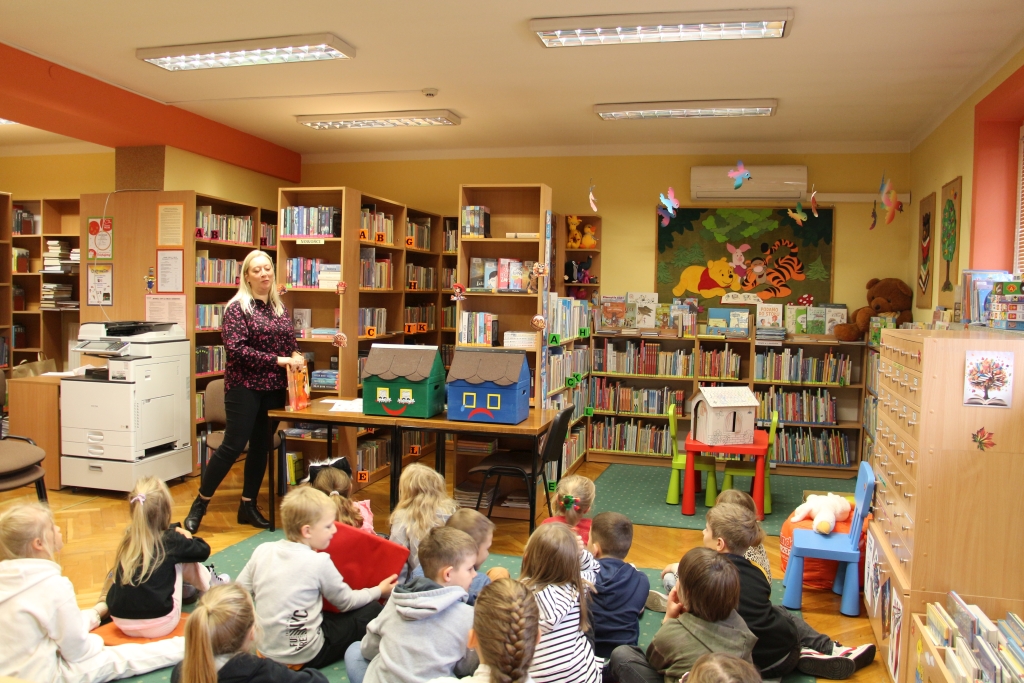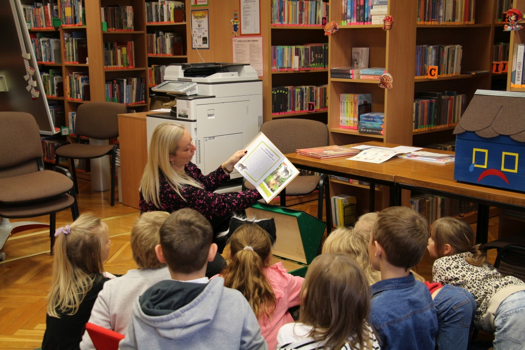 Spotkanie rozpoczęło się od krótkiej rozmowy o tym, czym jest biblioteka i jak można z niej korzystać. Dzieci z zainteresowaniem słuchały opowieści o tym, jak książki uczą, bawią i rozwijają wyobraźnię, a także jak ważną rolę odgrywają w codziennym życiu. Nie zabrakło też wspólnego przypomnienia zasad poszanowania książek i właściwego zachowania w bibliotece.