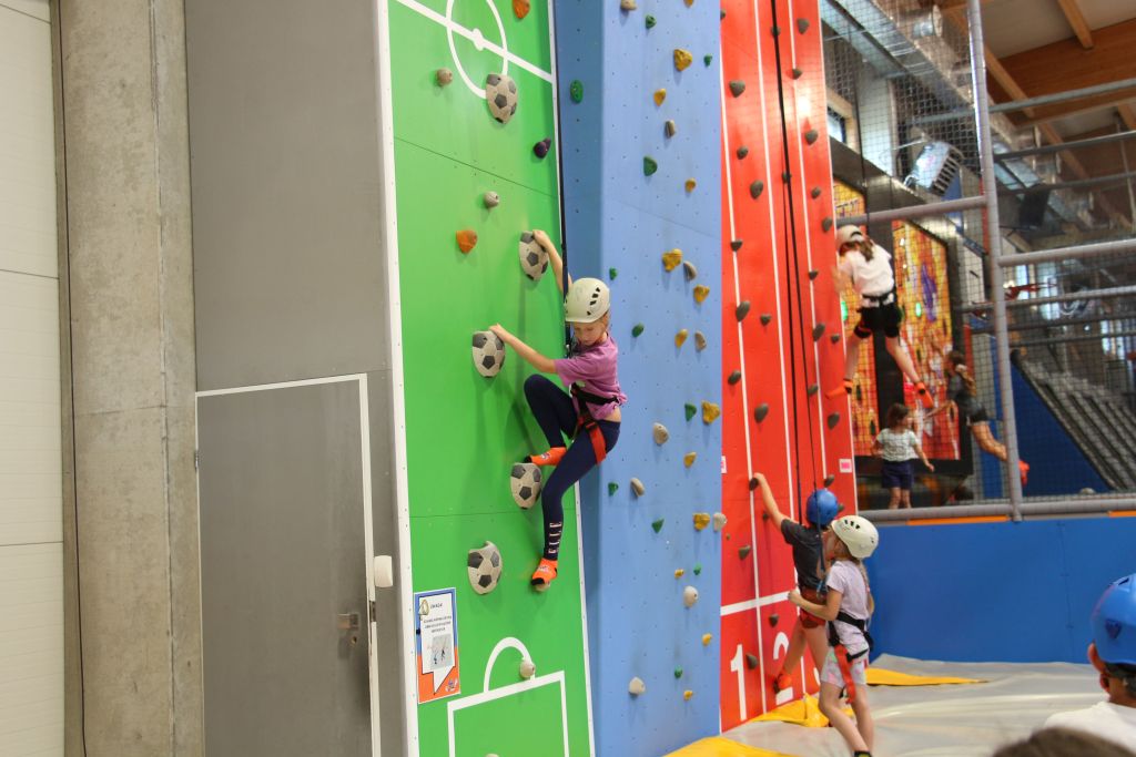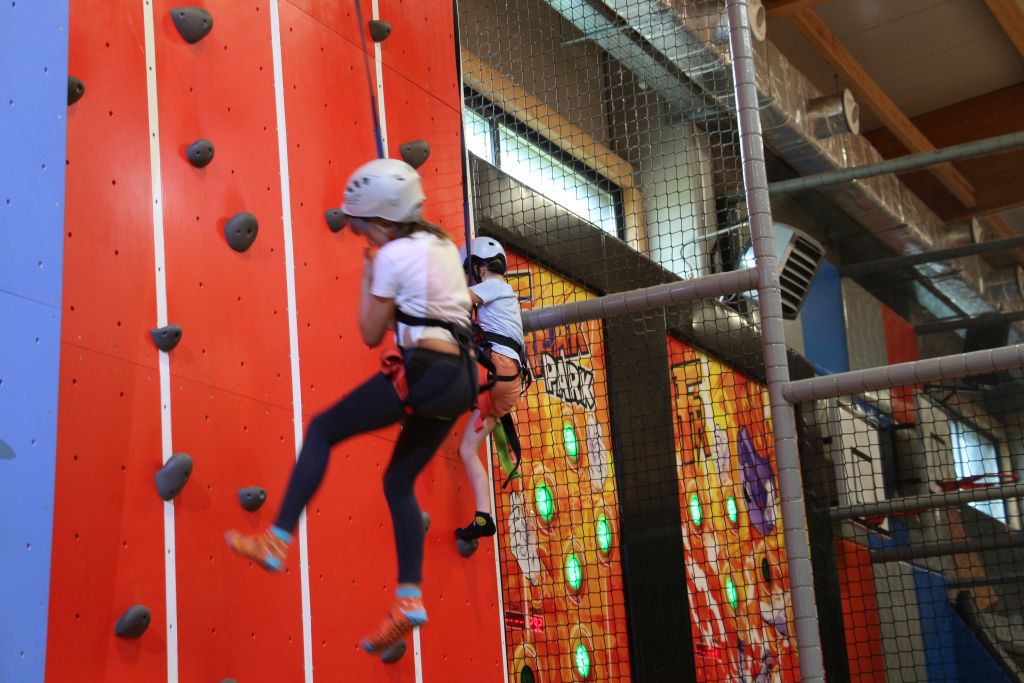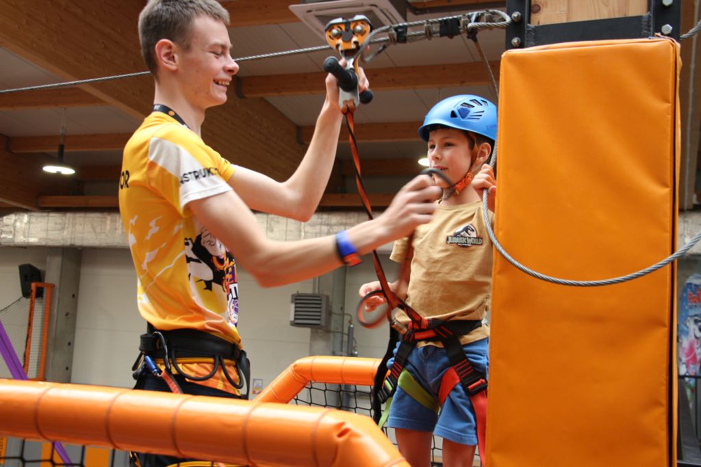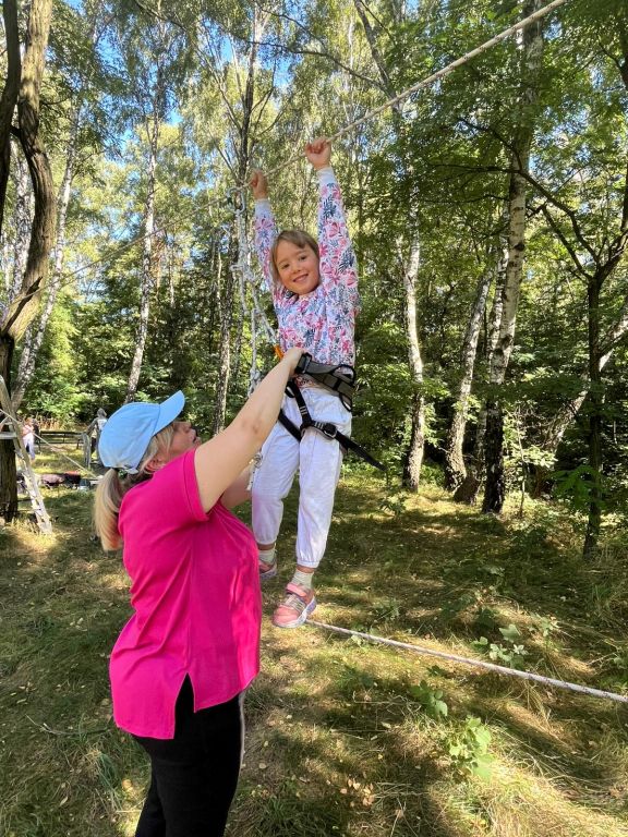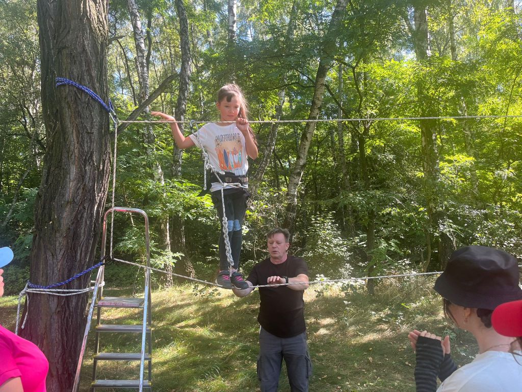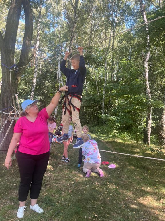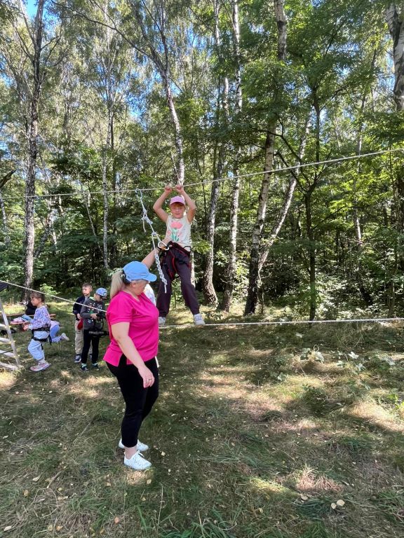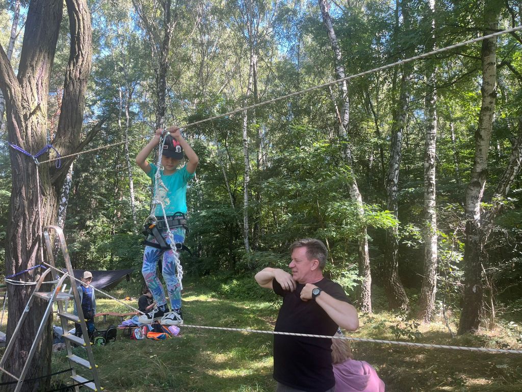 Nie zabrakło też chętnych do zmierzenia się ze ścianką wspinaczkową. Każdy udany chwyt wywoływał oklaski kolegów i koleżanek. Sporo emocji wzbudziła tyrolka zawieszona pod dachem – dzieci ustawiały się w kolejce, by choć raz przejechać się kilkumetrową trasą.