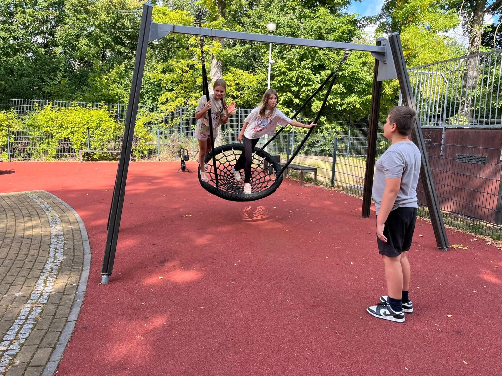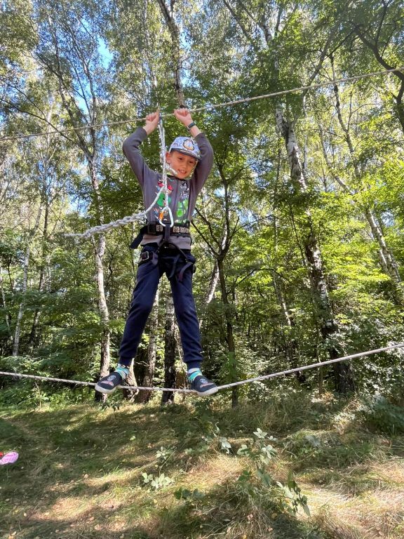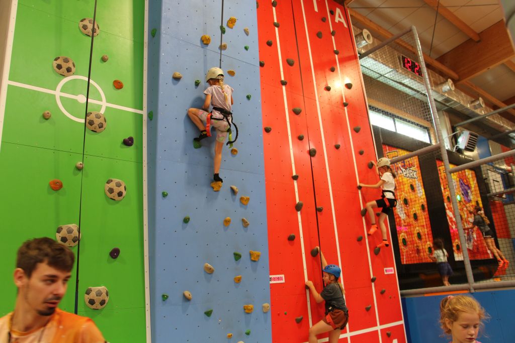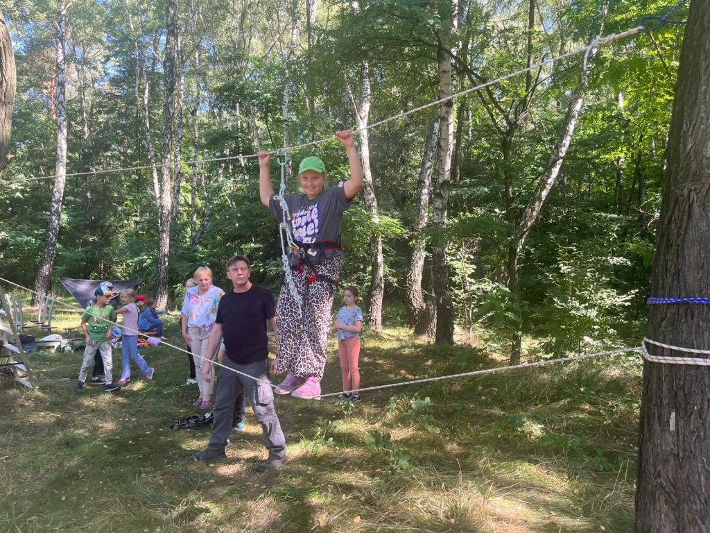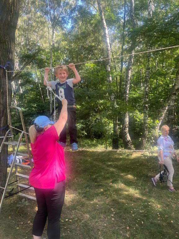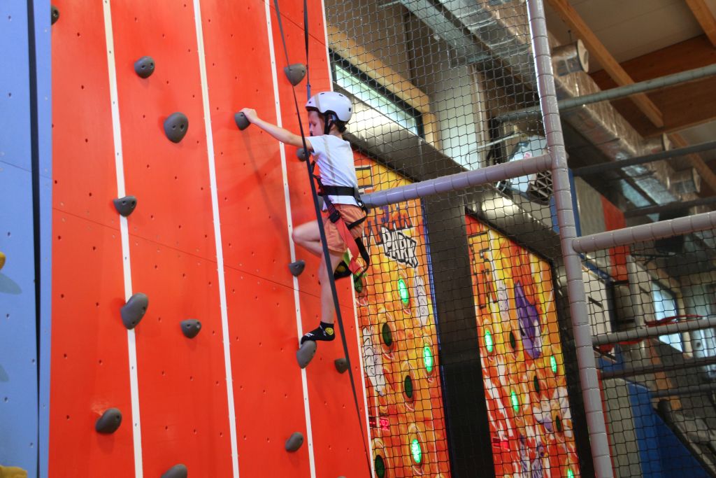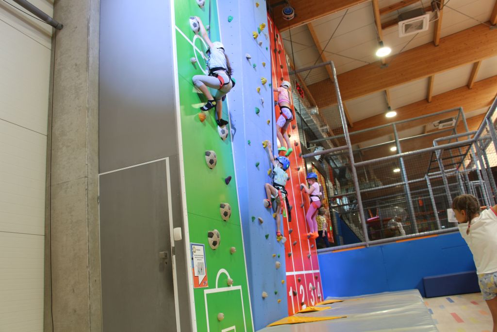 Nie zabrakło też chętnych do zmierzenia się ze ścianką wspinaczkową. Każdy udany chwyt wywoływał oklaski kolegów i koleżanek. Sporo emocji wzbudziła tyrolka zawieszona pod dachem – dzieci ustawiały się w kolejce, by choć raz przejechać się kilkumetrową trasą.