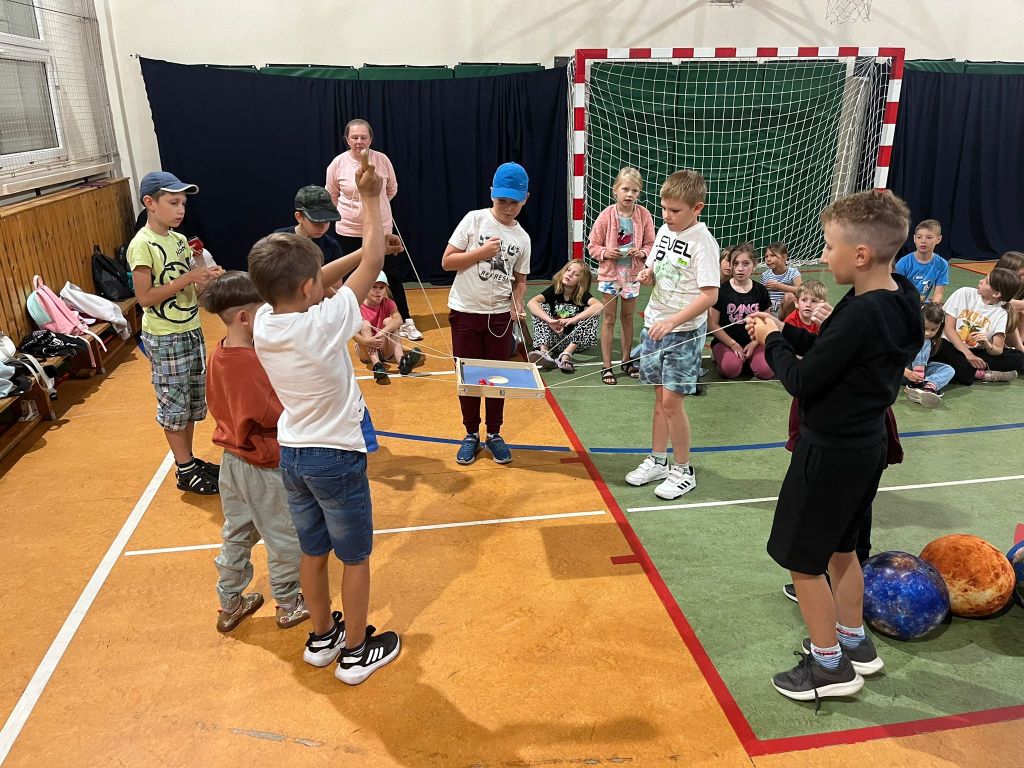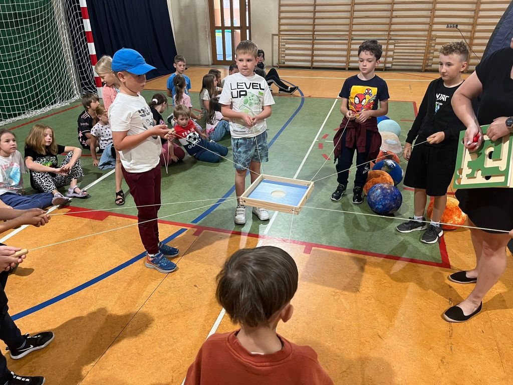 Wizyta w planetarium do dość spore logistyczne wyzwanie dla uczestników "Wakacji z Biblioteką" w Psarach. Skoro jednak "Mahomet nie może przybyć do góry, to góra przyszła do Mahometa". Na tej prostej zasadzie Mobilne Planetarium odwiedziło nas w ramach tegorocznej wakacyjnej akcji. Specjalna, nadmuchiwana kopuła (namiot w kształcie półkuli) stanął w sali gimnastycznej SP w Psarach (bo nasza sala wciąż w remoncie), a na sklepieniu kopuły dzieci mogły oglądać spektakl rozgwieżdżonego nocą nieba. Były to interesujące i bardzo pouczające zajęcia.