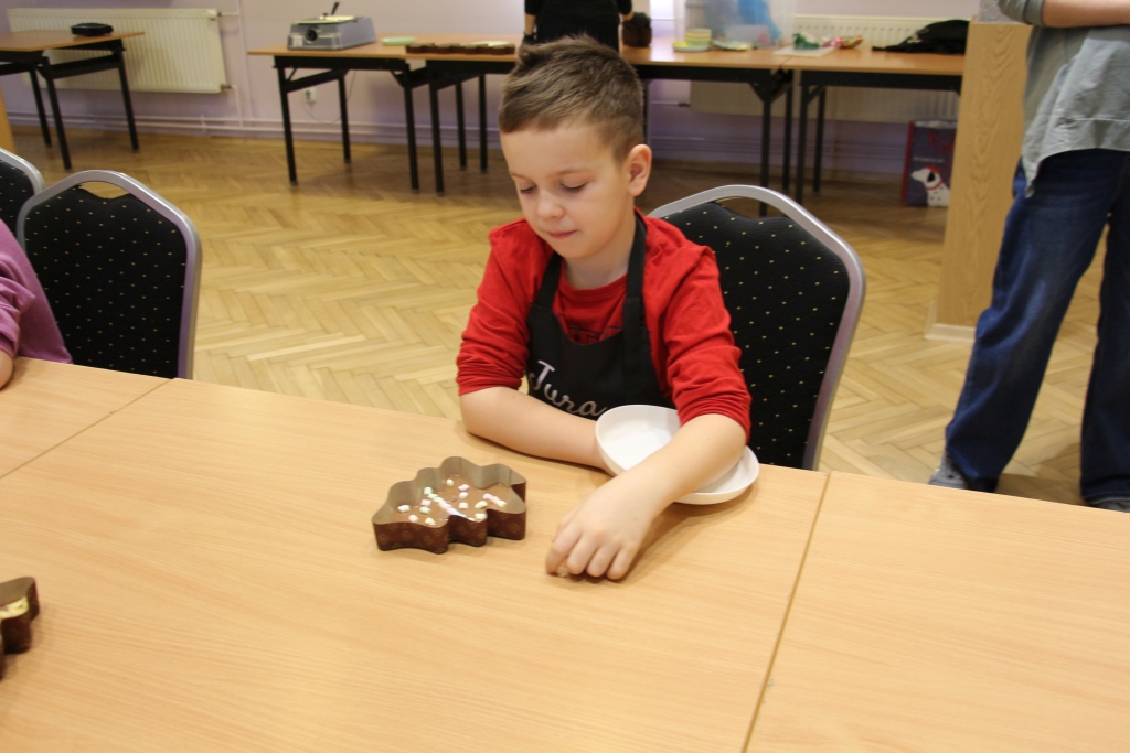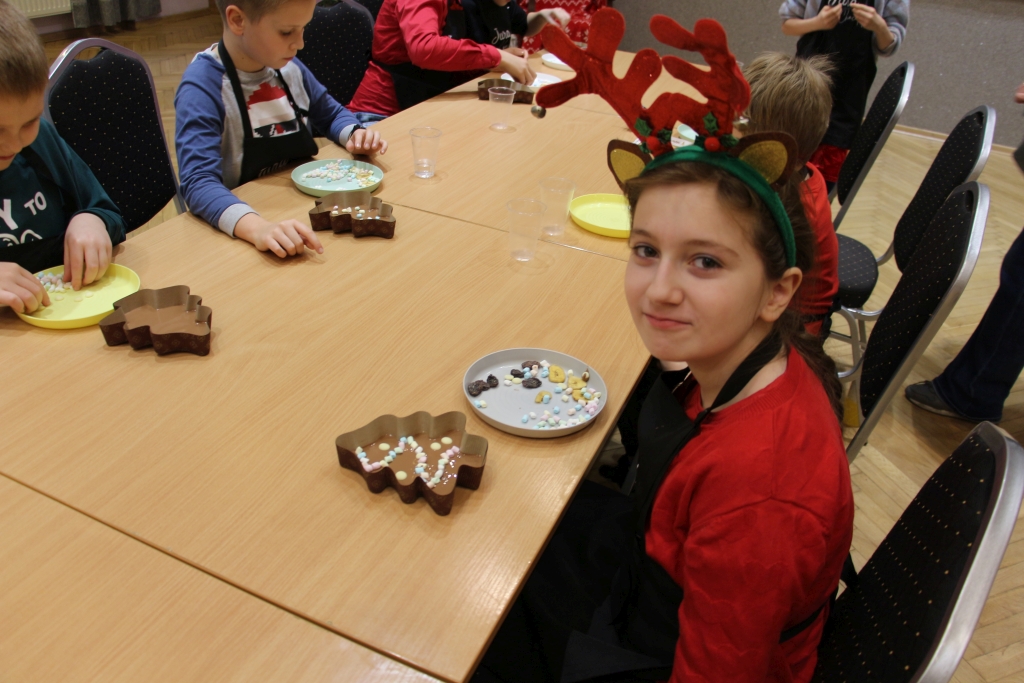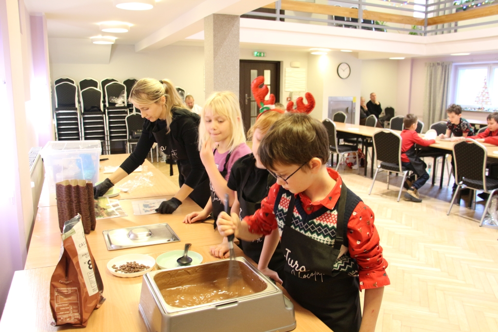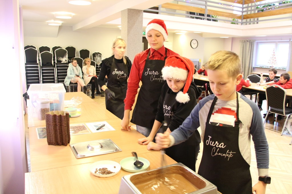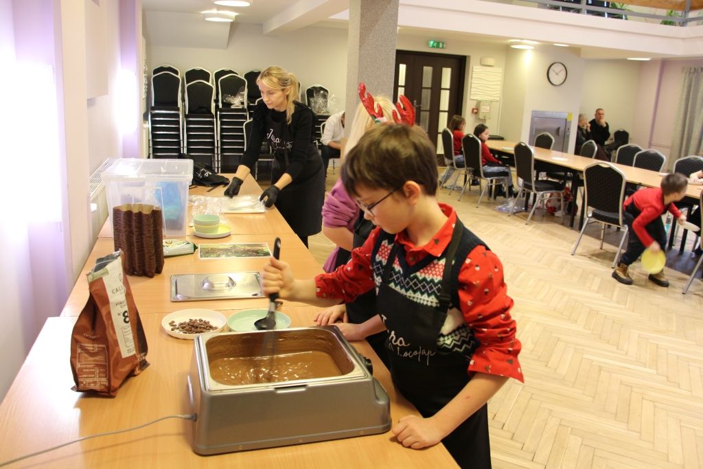 Po wykonaniu wspólnego zdjęcia, pożegnaliśmy naszego wspaniałego gościa, ale to nie był koniec atrakcji. Rozpoczęły się bowiem warsztaty – bardzo niezwykłe, bo czekoladowe! Najpierw dowiedzieliśmy się kilku ciekawostek o samej czekoladzie, a później odbyły się zajęcia praktyczne, na których każdy słuchacz wykonał, a właściwie ozdobił swoją, własną czekoladę! A potem mogliśmy nasze cuda zabrać do domu i wraz z domownikami – zjeść! Pycha!