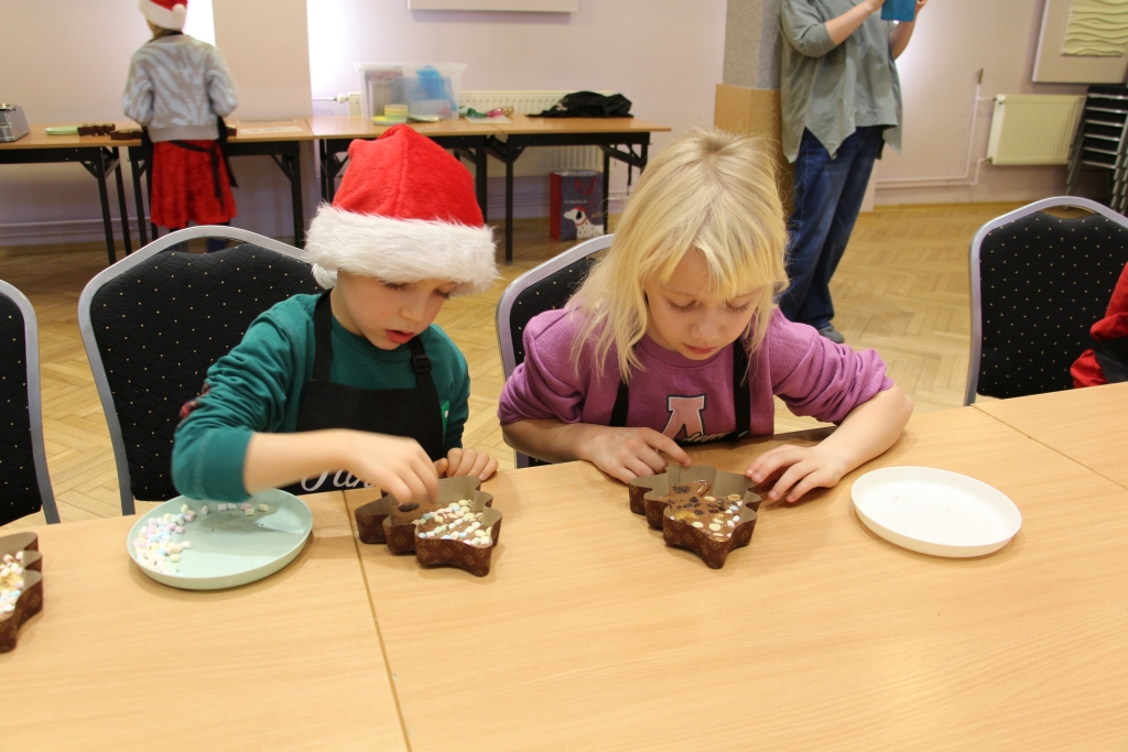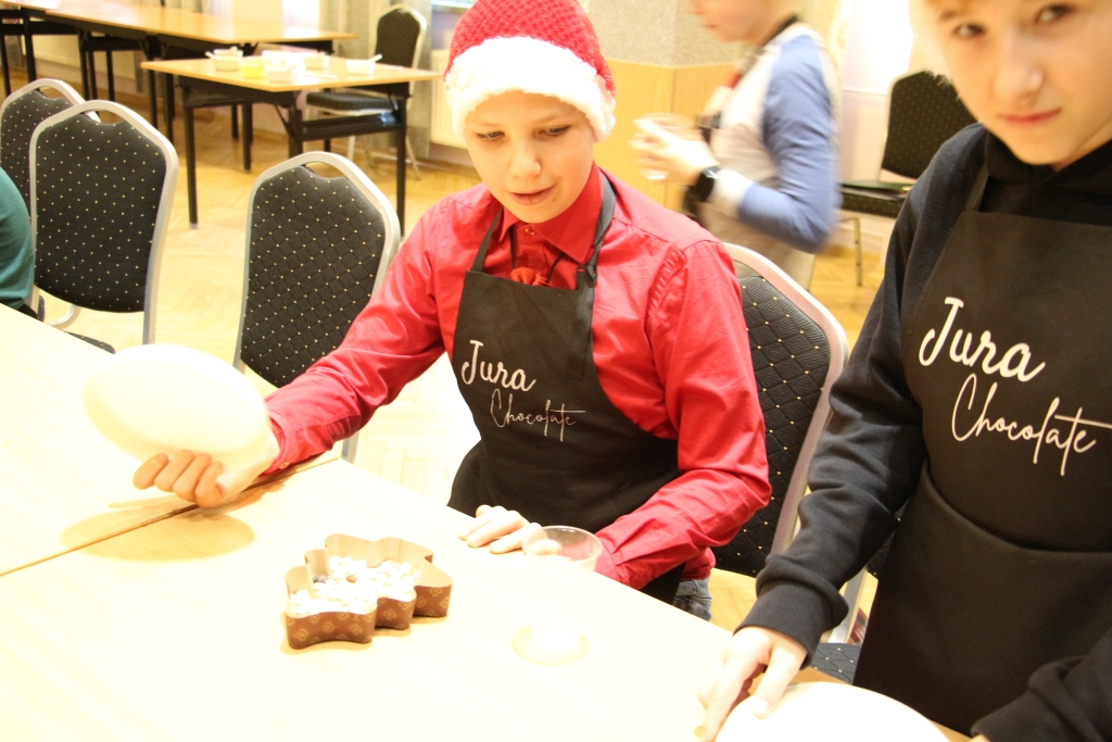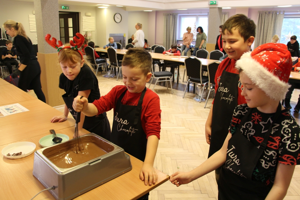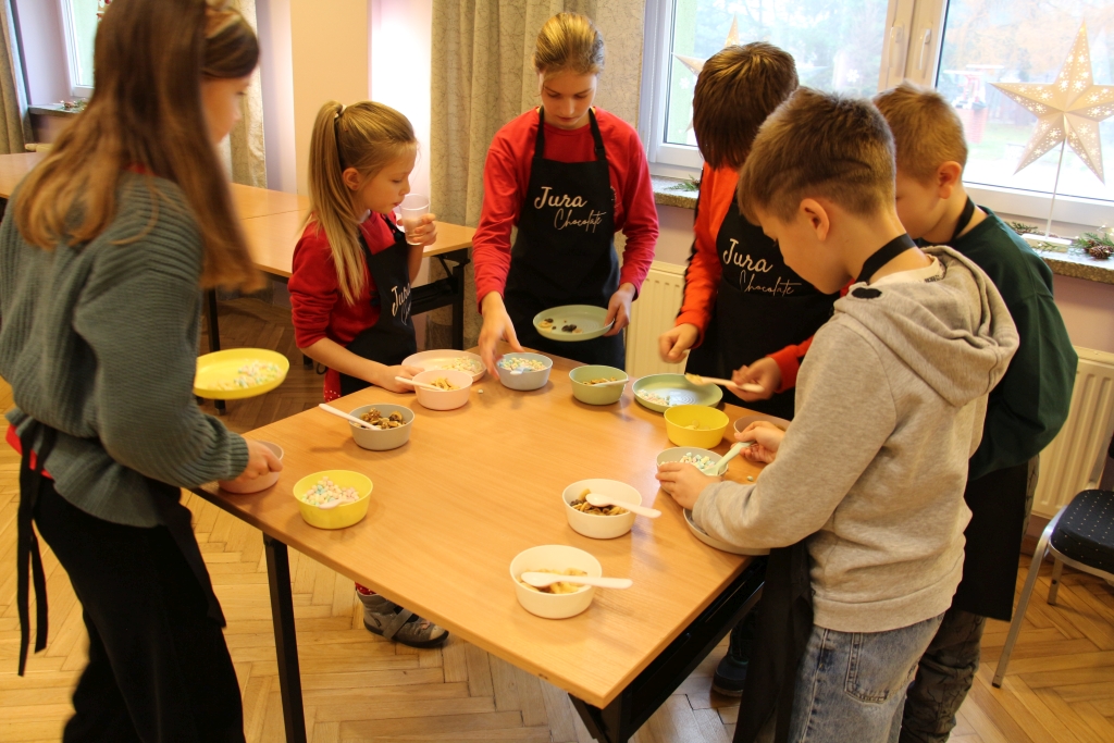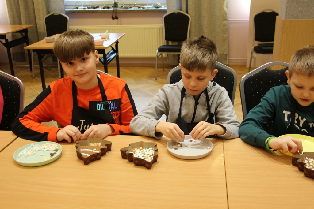 Po wykonaniu wspólnego zdjęcia, pożegnaliśmy naszego wspaniałego gościa, ale to nie był koniec atrakcji. Rozpoczęły się bowiem warsztaty – bardzo niezwykłe, bo czekoladowe! Najpierw dowiedzieliśmy się kilku ciekawostek o samej czekoladzie, a później odbyły się zajęcia praktyczne, na których każdy słuchacz wykonał, a właściwie ozdobił swoją, własną czekoladę! A potem mogliśmy nasze cuda zabrać do domu i wraz z domownikami – zjeść! Pycha!