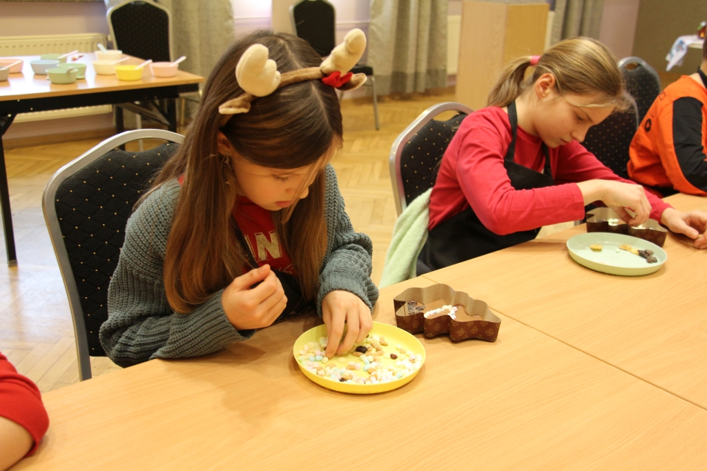 Dużo radości dostarczyły również zimowe zagadki oraz przygotowane karty pracy, dzięki którym uczniowie mogli utrwalić zdobytą wiedzę w formie zabawy. Na zakończenie każdy uczestnik wykonał własną, kolorową świąteczną skarpetę. To kreatywne zadanie okazało się prawdziwym hitem — dzieci z ogromnym zaangażowaniem ozdabiały swoje prace, tworząc niepowtarzalne, świąteczne dekoracje.