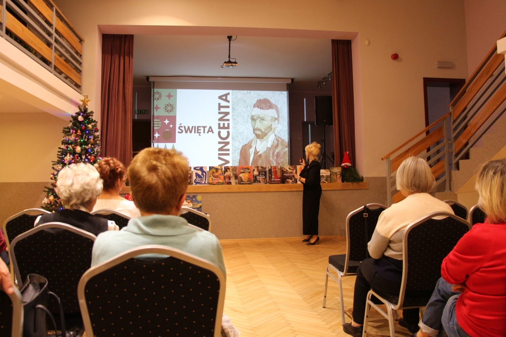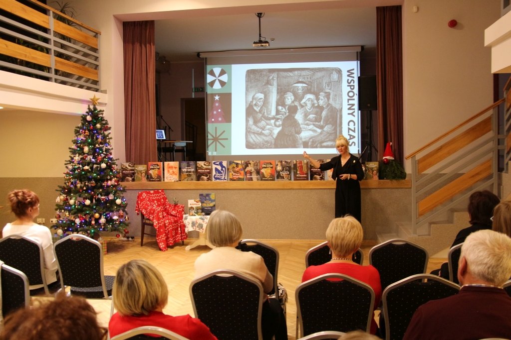 Prelegentka zabrała uczestników w inspirującą podróż przez motywy bożonarodzeniowe obecne w malarstwie wybitnych artystów: Zofii Stryjeńskiej, Vincenta van Gogha, Salvadora Dalego oraz Edvarda Muncha. Każdy z twórców stał się osobnym przystankiem tej opowieści – od ludowej, pulsującej rytmem tradycji wizji Stryjeńskiej, przez emocjonalną intensywność van Gogha, aż po niepokojącą symbolikę Muncha i surrealistyczne spojrzenie Dalego.