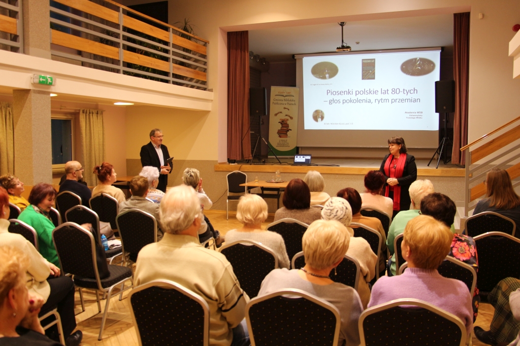 W murach naszej biblioteki zrobiło się w miniony czwartek wyjątkowo dźwięcznie i sentymentalnie. Podczas spotkania Uniwersytetu Trzeciego Wieku słuchacze mieli okazję uczestniczyć w wykładzie prof. Mirosława Kisiela, który zabrał nas w muzyczną podróż do lat osiemdziesiątych – dekady burzliwej, niepokornej, a zarazem zadziwiająco melodyjnej. Już od pierwszych minut było jasne, że nie będzie to sucha analiza nut i dat, lecz żywa opowieść o czasie, w którym piosenka bywała czymś więcej niż rozrywką – stawała się głosem pokolenia.