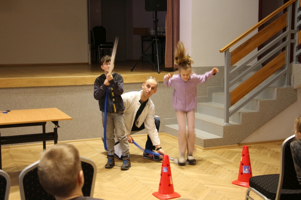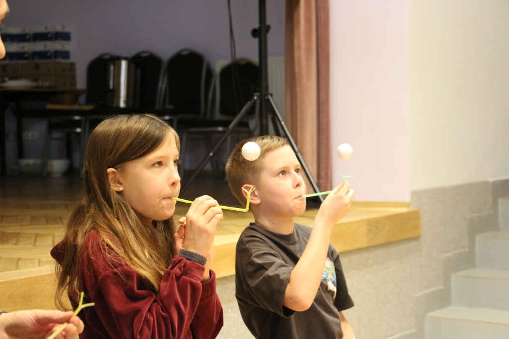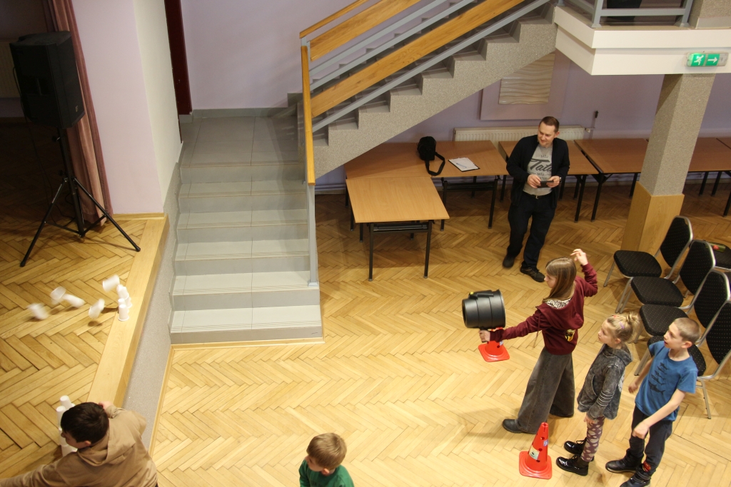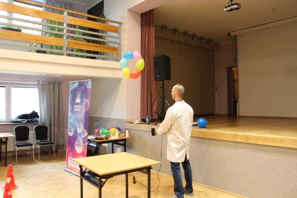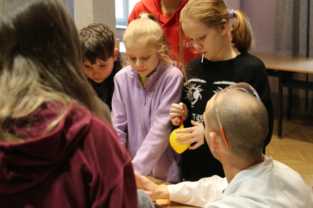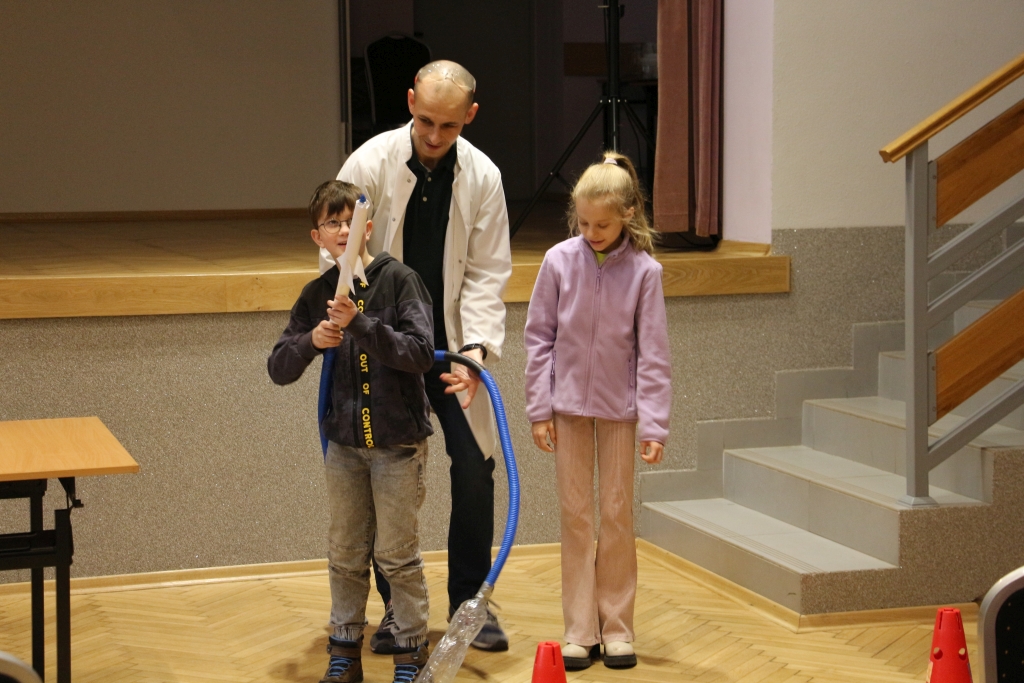 Skonstruowaliśmy wyrzutnię rakiet, która naprawdę działała! Strzelaliśmy powietrzem z bazooki – nie było to łatwe. Obserwowaliśmy „tańczące” piłeczki i wirujące baloniki. To co działo się na naszych oczach było magiczne, ale młodzi studenci, którzy bardzo aktywnie uczestniczyli w eksperymentach potwierdzają, że to jednak była nauka w najczystszej postaci. Ale – jak na każdych zajęciach z Panem Łukaszem, czujemy się zaczarowani.