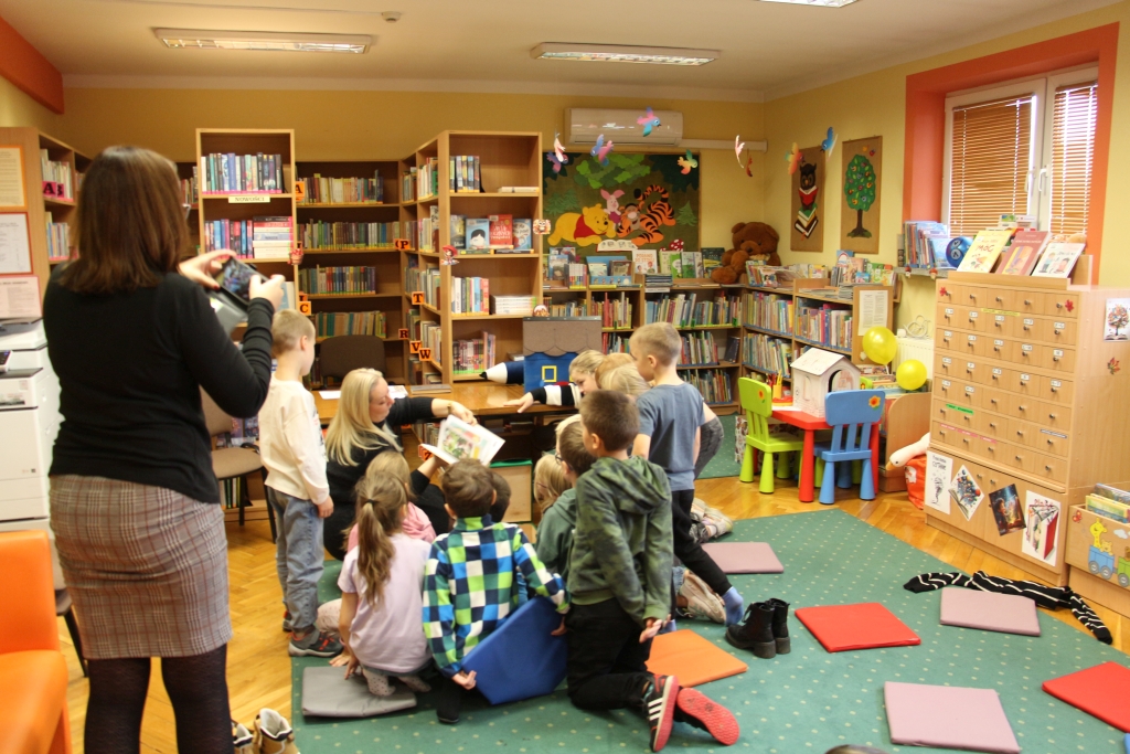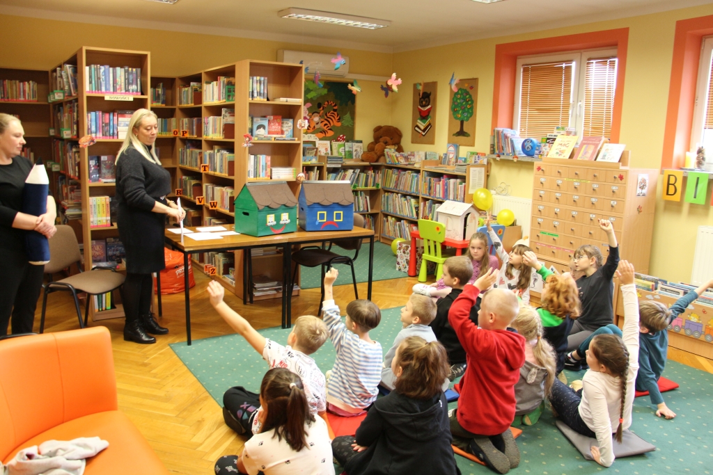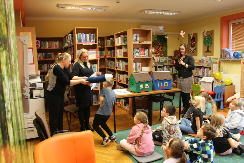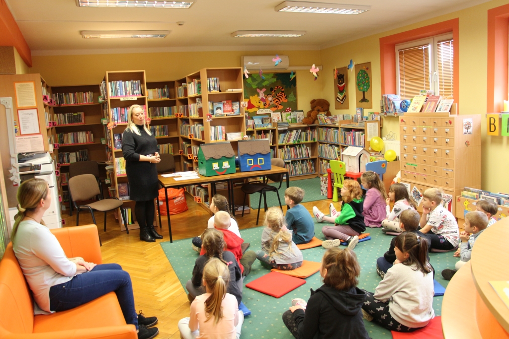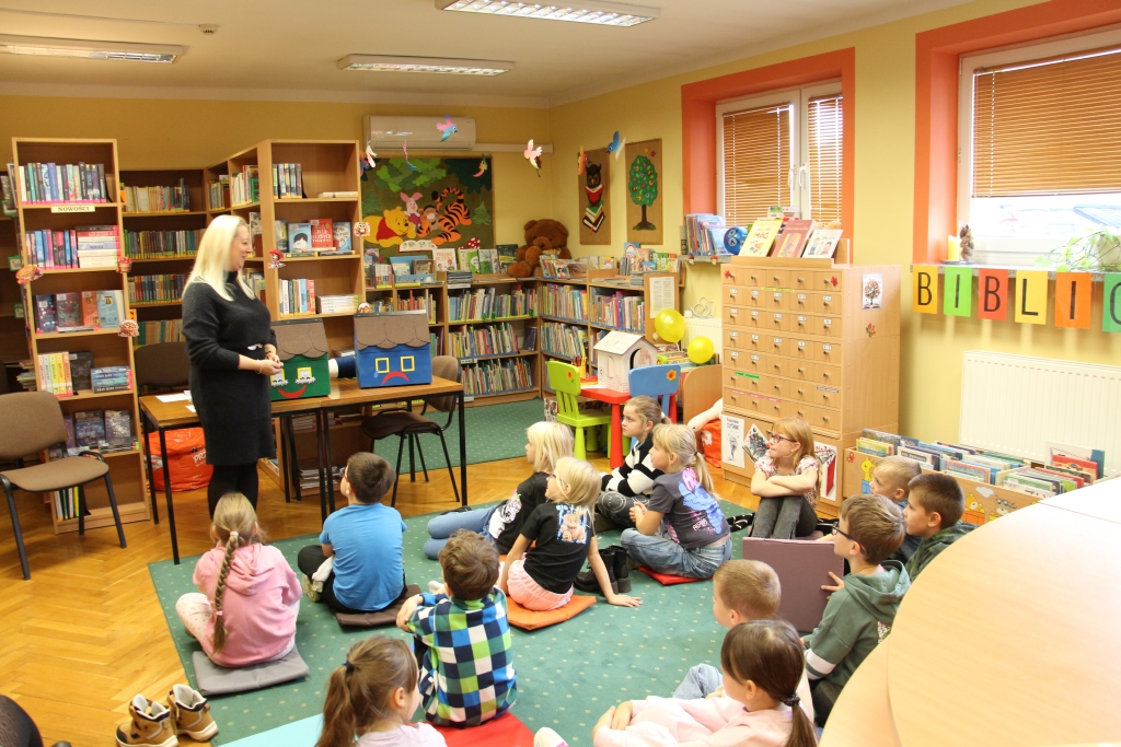 Spotkanie rozpoczęło się od krótkiej rozmowy o tym, czym jest biblioteka i jak można z niej korzystać. Dzieci z zainteresowaniem słuchały opowieści o tym, jak książki uczą, bawią i rozwijają wyobraźnię, a także jak ważną rolę odgrywają w codziennym życiu. Nie zabrakło też wspólnego przypomnienia zasad poszanowania książek i właściwego zachowania w bibliotece.