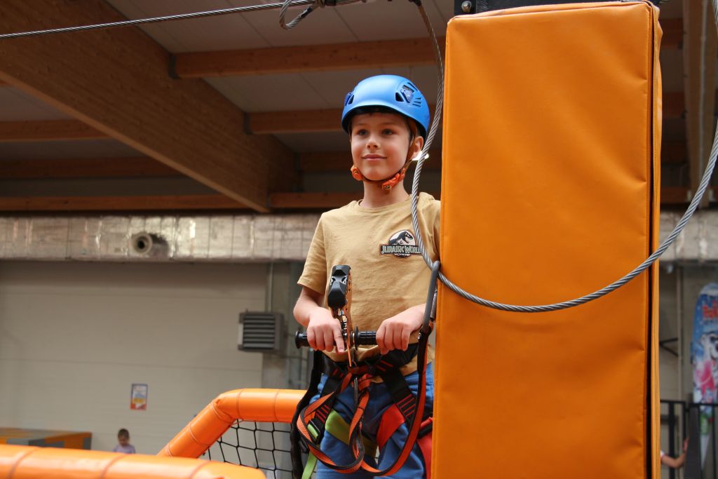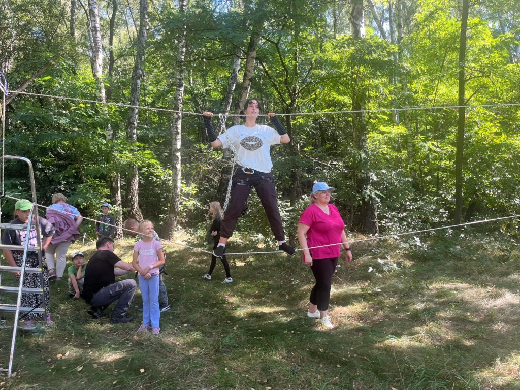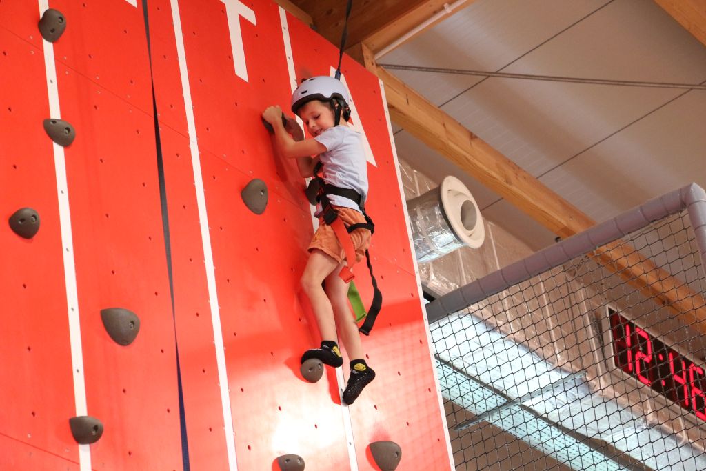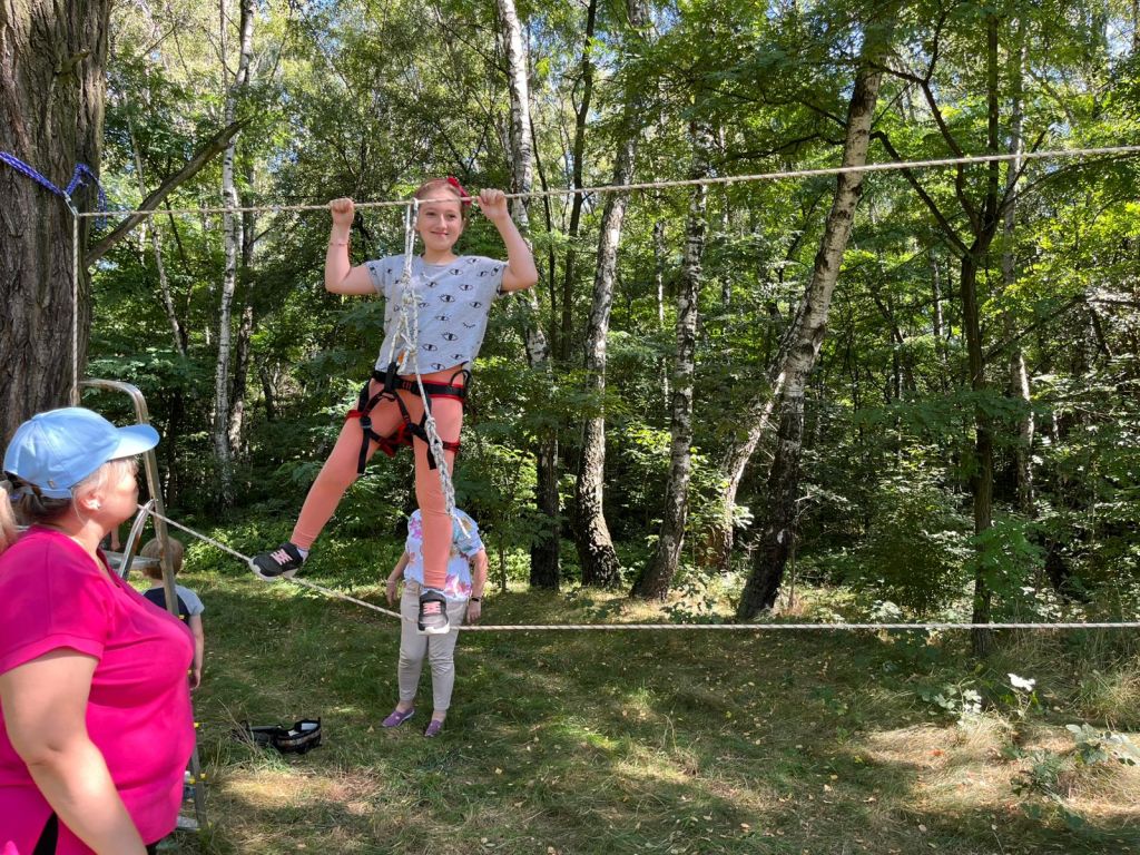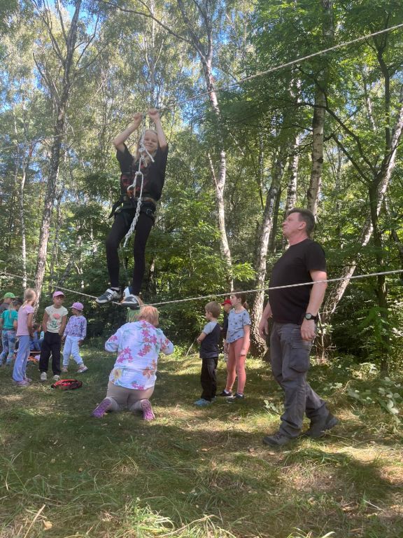 Nie zabrakło też chętnych do zmierzenia się ze ścianką wspinaczkową. Każdy udany chwyt wywoływał oklaski kolegów i koleżanek. Sporo emocji wzbudziła tyrolka zawieszona pod dachem – dzieci ustawiały się w kolejce, by choć raz przejechać się kilkumetrową trasą.