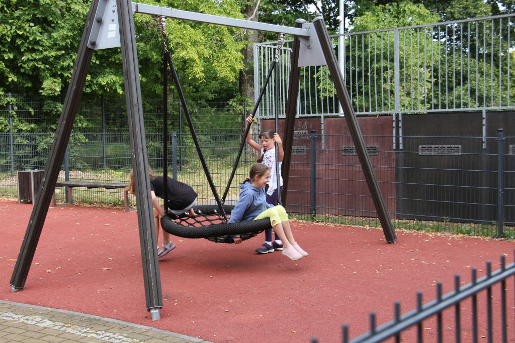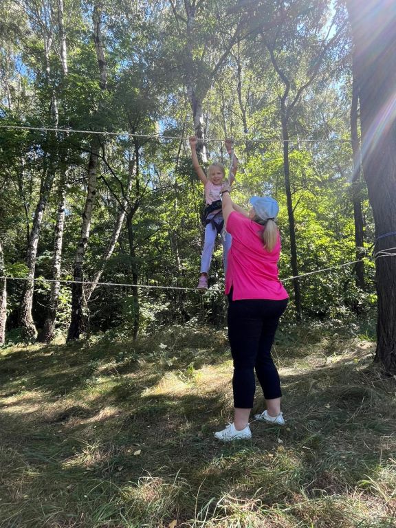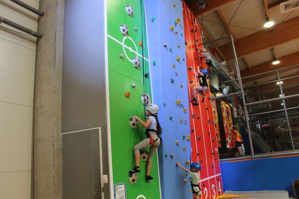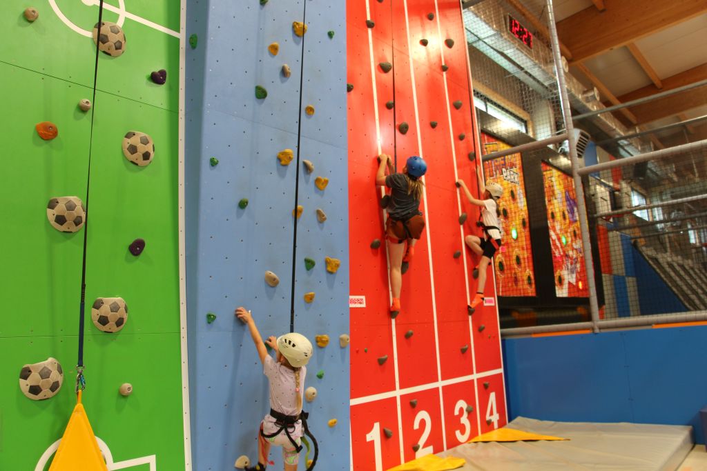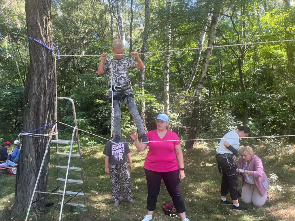 Nie zabrakło też chętnych do zmierzenia się ze ścianką wspinaczkową. Każdy udany chwyt wywoływał oklaski kolegów i koleżanek. Sporo emocji wzbudziła tyrolka zawieszona pod dachem – dzieci ustawiały się w kolejce, by choć raz przejechać się kilkumetrową trasą.